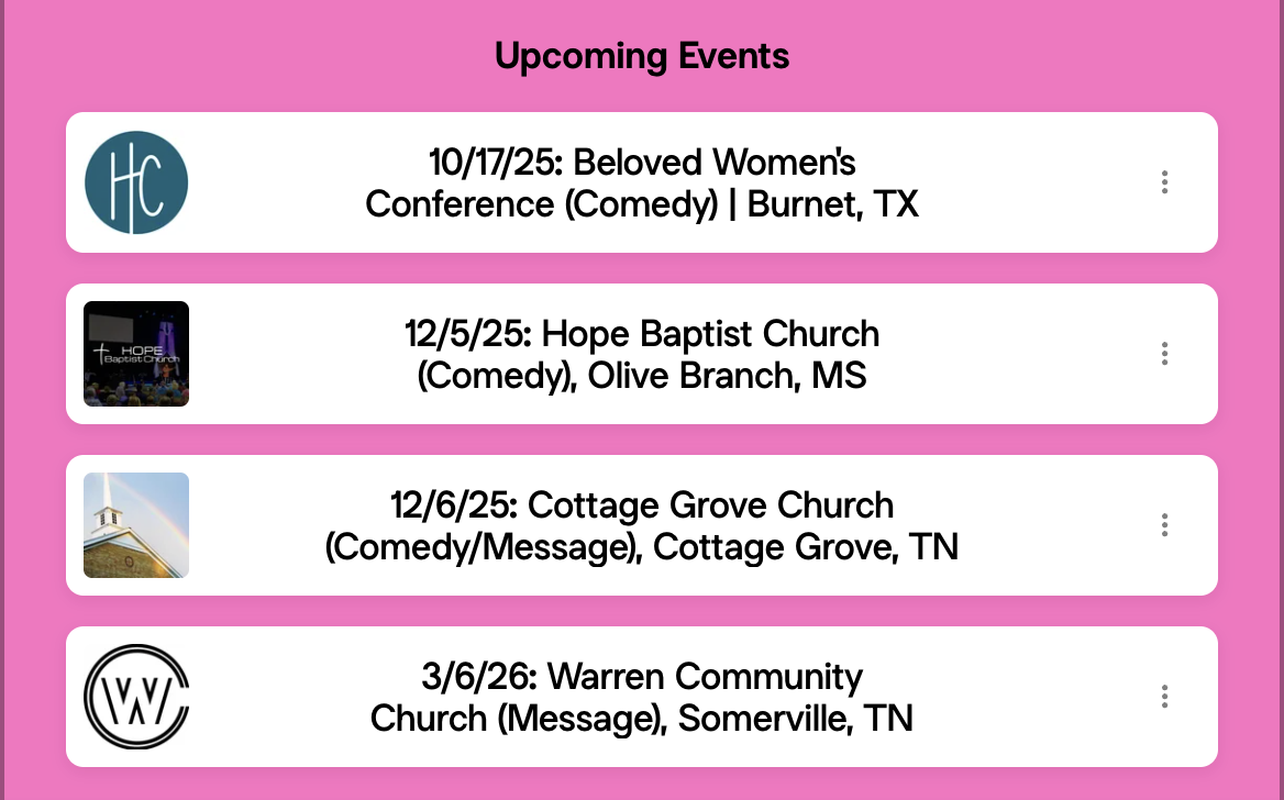 I’ve been telling jokes from a stage since 2021 by incorporating humor into my Bible teaching. In 2023 I officially stepped out into the world of stand up comedy. I was the headlining comic on a 10-date nationwide tour in 2024!